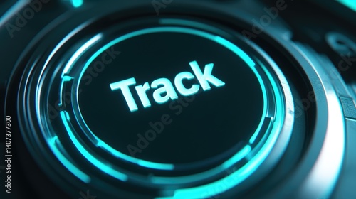 Futuristic Teal Track Button Interface Technology Digital Concept Abstract Closeup of a glowing Track button