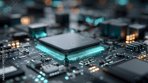 Futuristic technology concept displays a glowing blue microchip processor on a circuit board with neon blue data lines and deep shadows.
