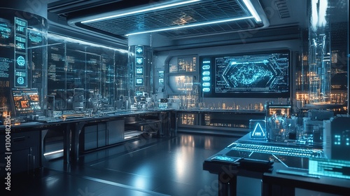 Futuristic technology in high-tech laboratory with young scientist focused on computer screen