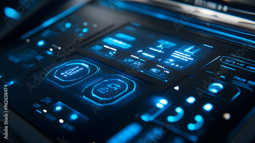 Futuristic Technology Interface with Blue Glowing Buttons - 3D Illustration