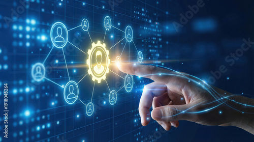 Futuristic technology network connection concept with digital business hand touching human resource management system representing global innovation and confident professional efficiency