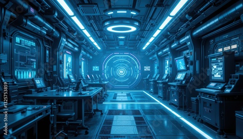 Futuristic technology setup sci-fi laboratory digital workspace high-tech environment wide-angle view innovation concept
