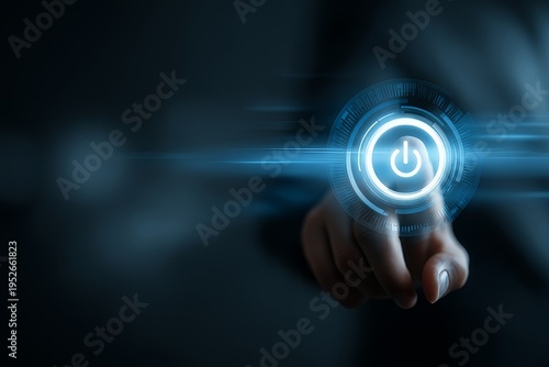 Futuristic touch interface interaction, finger pressing glowing blue circular button with ripple effect, digital technology concept, high-tech UI/UX design, cyberpunk aesthetic, dynamic light and moti