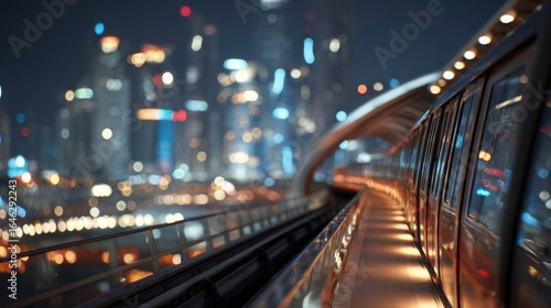 Futuristic train speeding through a bustling station, with a vibrant cityscape blurred in the background, creates an energetic urban atmosphere during the night
