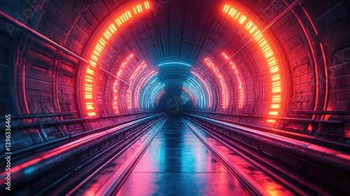 Futuristic tunnel, neon lights, transport, cyberpunk background, video game