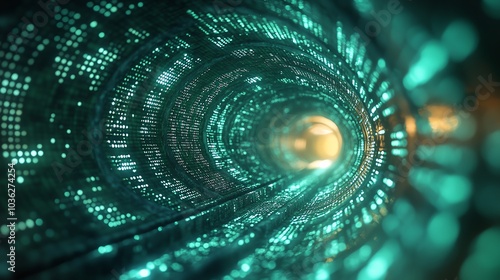 Futuristic tunnel with glowing digital patterns and lights, abstract design