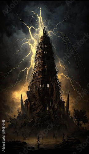 Futuristic ultra modern tower and the background is dark, thunders, hd ultra realistic