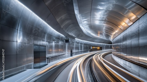 Futuristic Underground Tunnel with Glimmering Light Trails and Reflective Metallic Architecture, Perfect for Urban Transportation and Infrastructure Themes