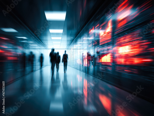 Futuristic urban corridor with blurred motion and vibrant digital displays