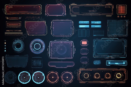 Futuristic User Interface Elements Neon Glowing Digital Screens and Displays