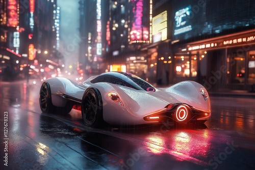 Futuristic vehicle navigating a neon-lit city street during winter festivities under rainfall