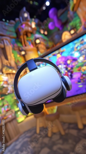 Futuristic VR Close-up: Hovering Over Vibrant Video Game Screen. Abstract Fantasy Landscape with Blurred Characters. Symbolizes Free VR Gaming Excitement and Sci-Fi Adventure. Ideal for Book Covers, C
