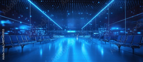 Futuristic waiting area with blue neon lights and rows of empty chairs.