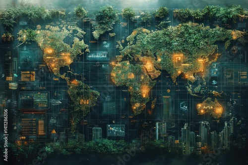 Futuristic world map with overlaid data and vegetation