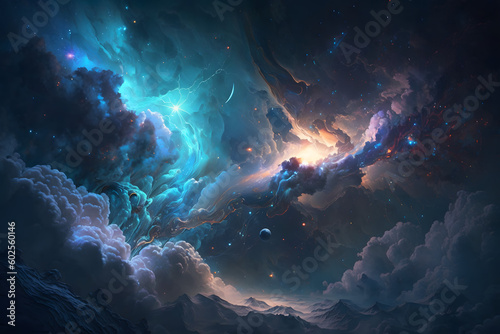 Galaxy with colorful nebula shiny stars and heavy clouds background