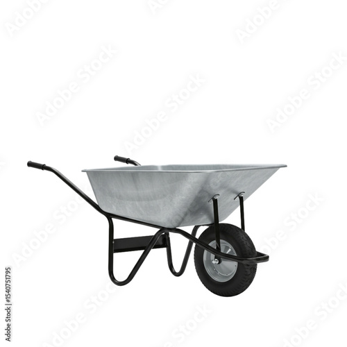 Galvanized wheelbarrow with black handles and tire on white background