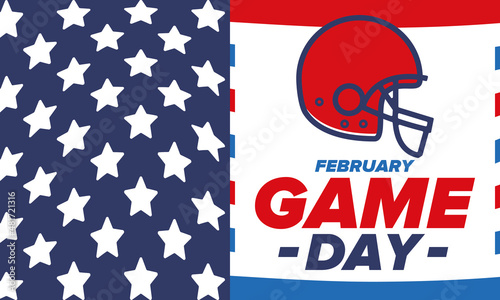 Game Day. American football playoff. Super Bowl Party in United States. Final game of regular season. Professional team championship. Ball for american football. Sport poster. Vector illustration
