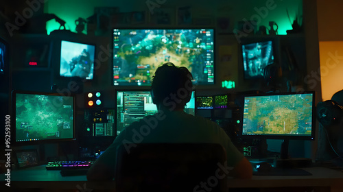 Gamer in dimly lit room intensely focused on high-tech console, surrounded by multiple screens and gaming memorabilia, immersed in vibrant gaming environment