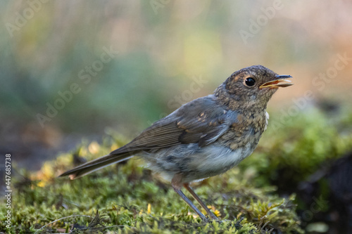 Garden Birds. Robin juvenile Erithacus rubecula sitting on a tree branch