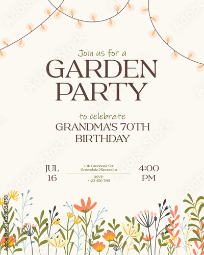 Garden party invitation template. Botanical frame in flat doodle style. Frame with hand drawn vector floral elements. Spring branches, flowers, leaves and petals. Pastel colors