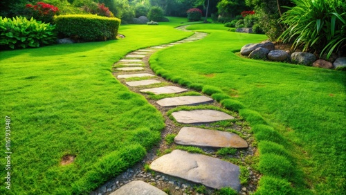 Garden stone path winding through lush green grass, garden, stone, path, grass, nature, outdoor, landscape, tranquil