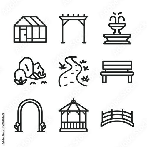 Garden Structures Icons. Outline icon set of garden structures and features: greenhouse, pergola, fountain, rock garden, pathway,
