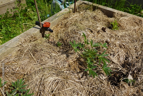 Gardener mulching vegetable garden bed with dry straw for weed control