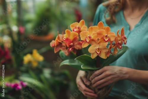 Gardener showcasing a vibrant orange orchid amidst a greenhouse brimming with a variety of colorful flowers and lush greenery