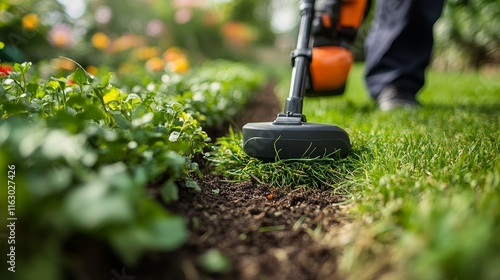 Gardener trims grass along a stone pathway in a vibrant garden during springtime