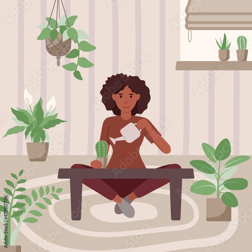 Gardening at home concept with woman watering indoor plants. Urban jungle, urban garden, home garden and cozy home. flat illustration.