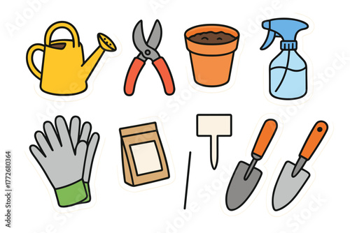 Gardening tools collection with watering can, gloves, and trowels - Concept of set of vector stickers