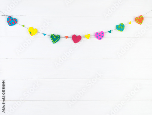 Garland of plasticine hearts on white wooden background