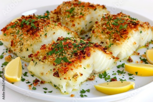 Garlic and Herb Ritz Crusted Cod on Lemon Wedges