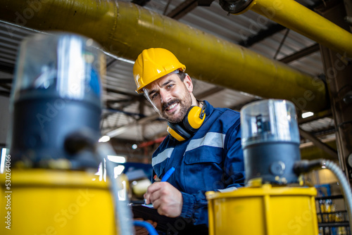 Gas pipe inspector doing quality control inside refinery storage room.