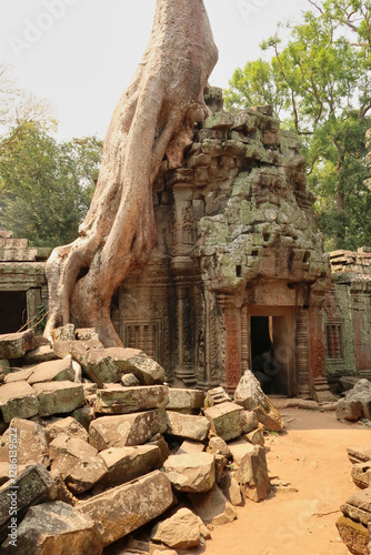 Gate, door, doorway inside the Ta Prohm Temple, covered in red, green moss, lichens, with a tree growing on top, stones, bricks in the foreground, Angkor Wat, Siem Reap, Cambodia
