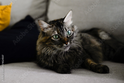Gato de pelo largo descansando sobre un sofa