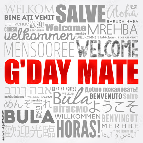 G'day Mate (Welcome in Australian) word cloud in different languages, conceptual background