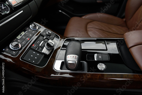 Gear shift lever for automatic transmission. Engine start button close up. Elements of a luxury premium sedan. Car air conditioning and climate control. The interior of a modern business class car.