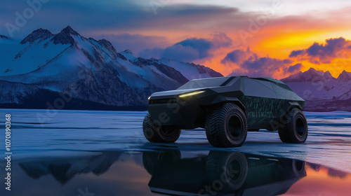 Geländewagen vor einer beeindruckenden Berglandschaft bei Sonnenuntergang