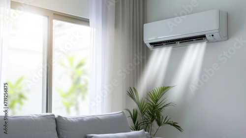 General air conditioner with modern bright living room background