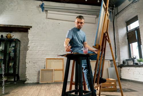 general shot young artist in a blue t-shirt in an art studio working on painting while sitting