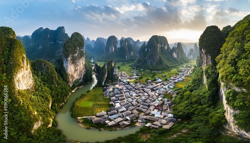 Generated image Overhead view of a village nestled at the base of rugged karst formations