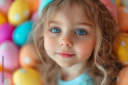 Generative AI image of a young child celebrating Easter Day surrounded by colorful decorated eggs