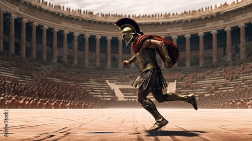 Generative AI, Realistic illustration of a fierce gladiator attacking, running. Armoured roman gladiator in combat wielding a sword charging towards his enemy.