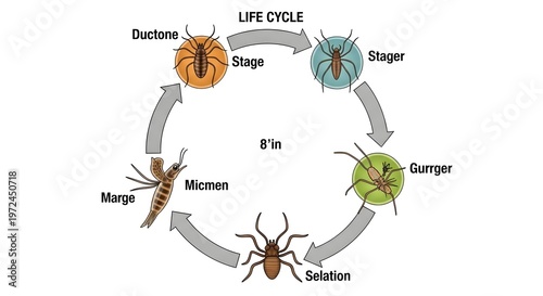 Generic insect life cycle diagram arranged in a circular format, showing multiple immature stages transforming through larval and nymph forms into an adult bug, emphasizing sequential growth and molti