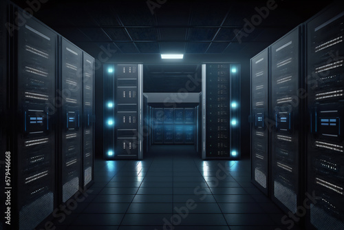 Genertive ai illustration of data center room with computers and storage systems..