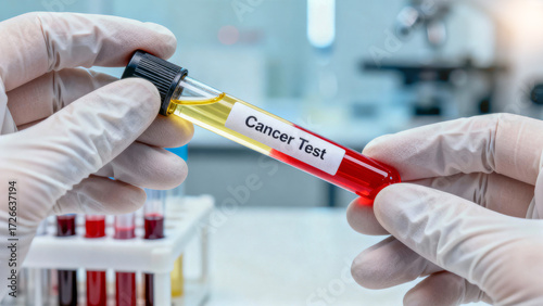 Genetic screening blood sample for cancer detection in laboratory with gloved hands