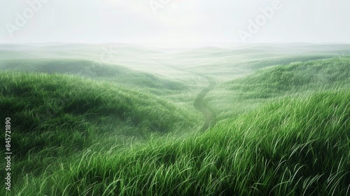 gentle breeze rustling through a vast lush green grass meadow, with a winding path leading into the distance.