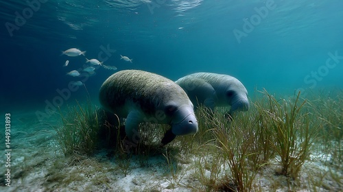 Gentle giants: manatees grazing peacefully in the crystal-clear ocean water