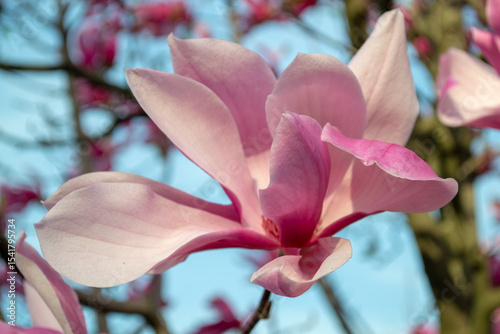 Gentle pink Magnolia soulangeana Flowers on a twig blooming against clear blue sky at spring